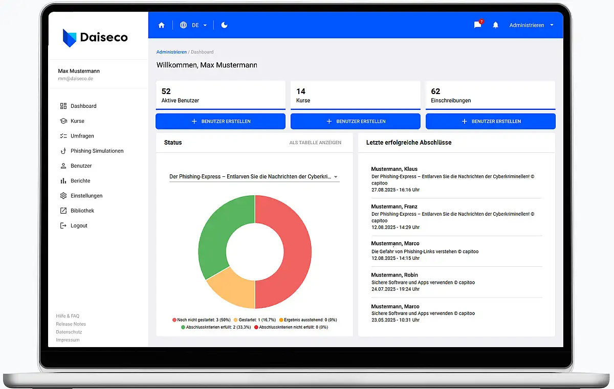 Für HR-Verantwortliche, die ressourcenschonend ihre gesetzlichen Schulungspflichten erfüllen und anspruchsvolle Awareness-Ziele erreichen wollen: Mit der großen Kursbibliothek erweitern Sie Ihr Lernmanagementsystem sofort um hunderte Stunden Lernmaterial. Alle Inhalte sind fachlich fundiert, praxisnah aufbereitet, didaktisch geprüft und stets aktuell. Zudem sind sie responsiv und konsequent auf Microlearning optimiert, damit sie flexibel in den Arbeitsalltag Ihrer Mitarbeitenden passen.